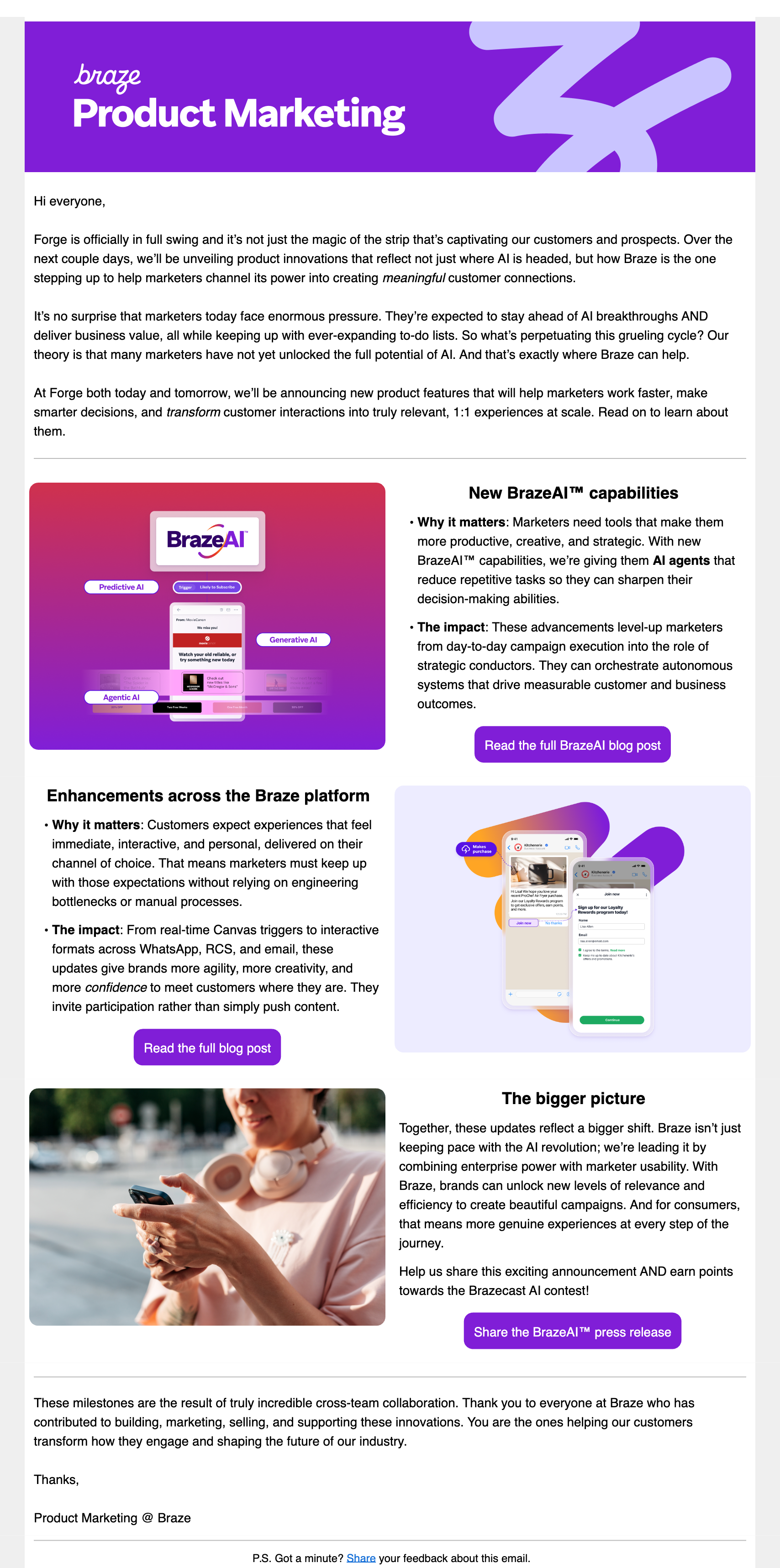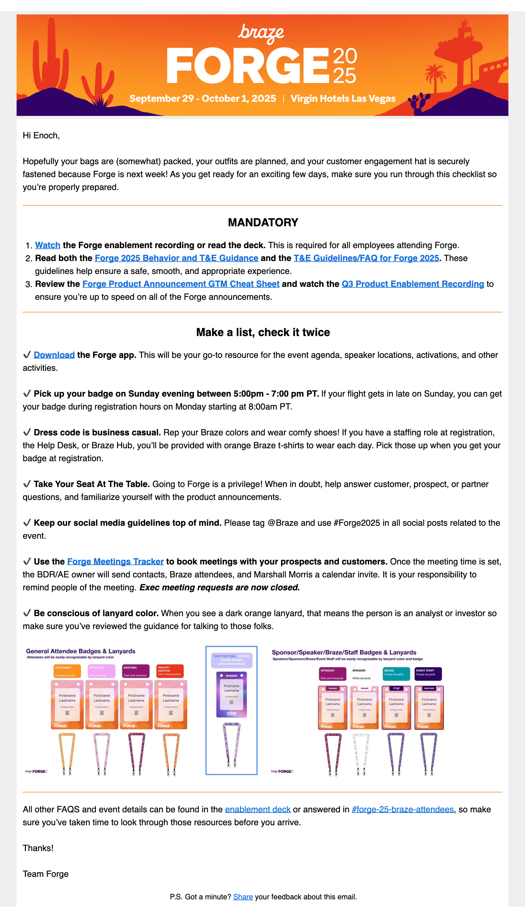 I led the employee advocacy campaign, which meant drafting copy to surprise and delight employees during the lead-up to Forge 2025. There were a lot of moving parts for this campaign, so to build a shared voice, I used the Braze mascot, Torchie, for help.
